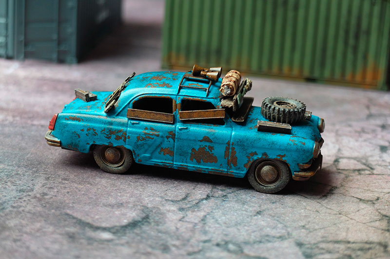 La Cage a été construite à partir d'une prison medfan en MDF. Une fois assemblée, elle a été fixée sur un bâtonnet de coton-tige aux extrémités duquel avait été installées des roues de voitures au 1/43e.